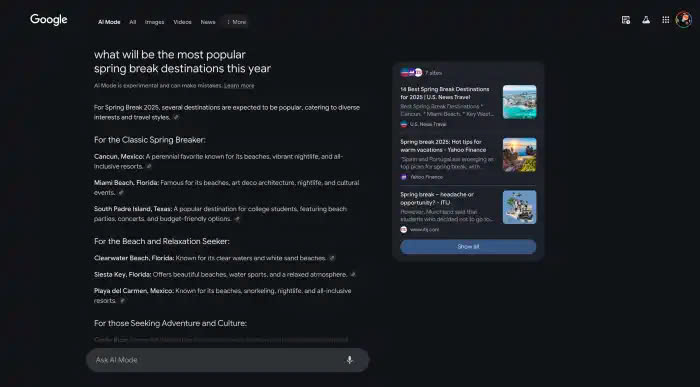 Khi bạn thực hiện bất kỳ Tìm kiếm nào, băng chuyền bộ lọc sẽ hiển thị nút “AI Mode” mới ở bên trái để chuyển khỏi kết quả thông thường và truy cập trải nghiệm mới.